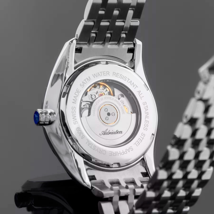 Функции: Центральные часовая, минутная и секундная стрелки. Апертура даты в позиции 3 часов.