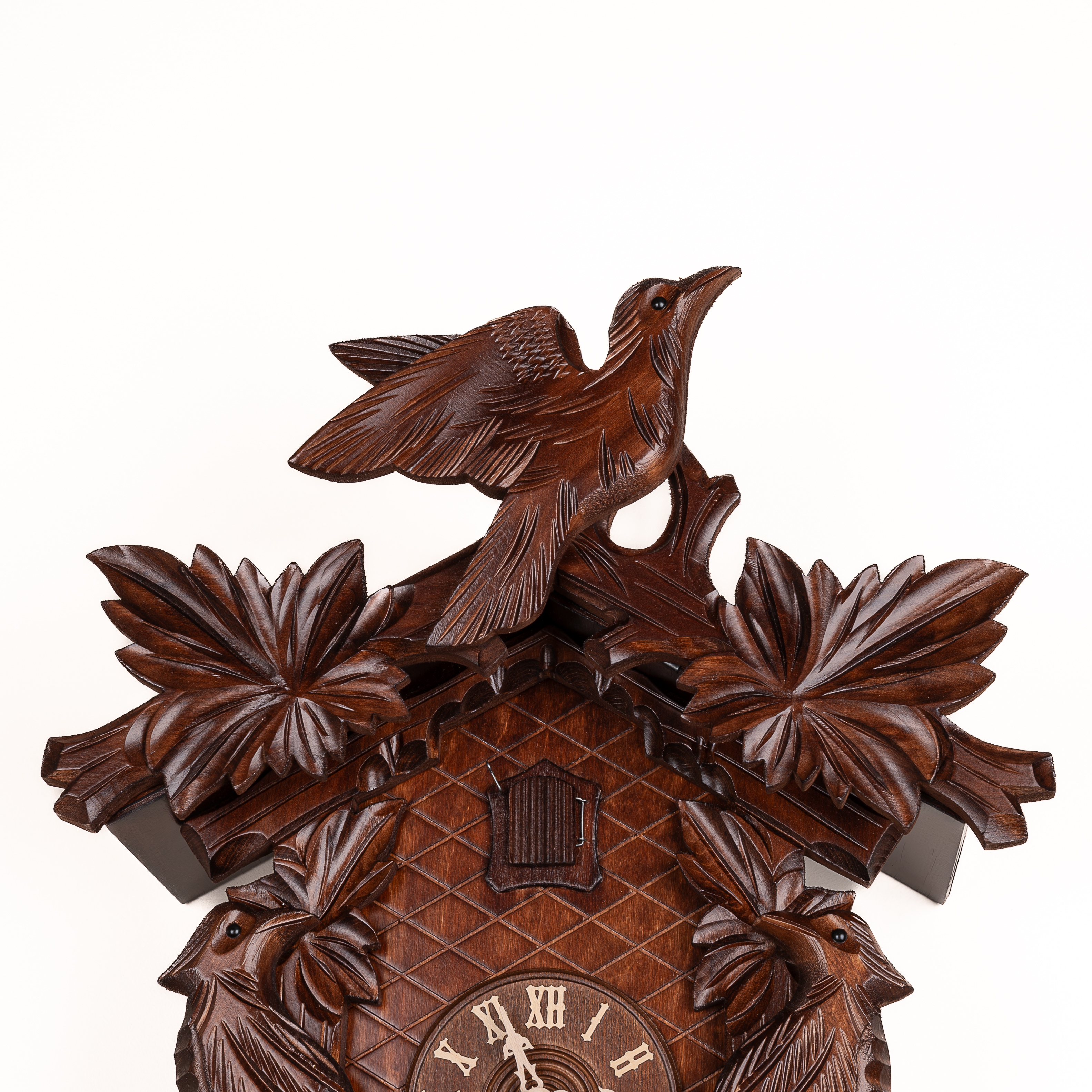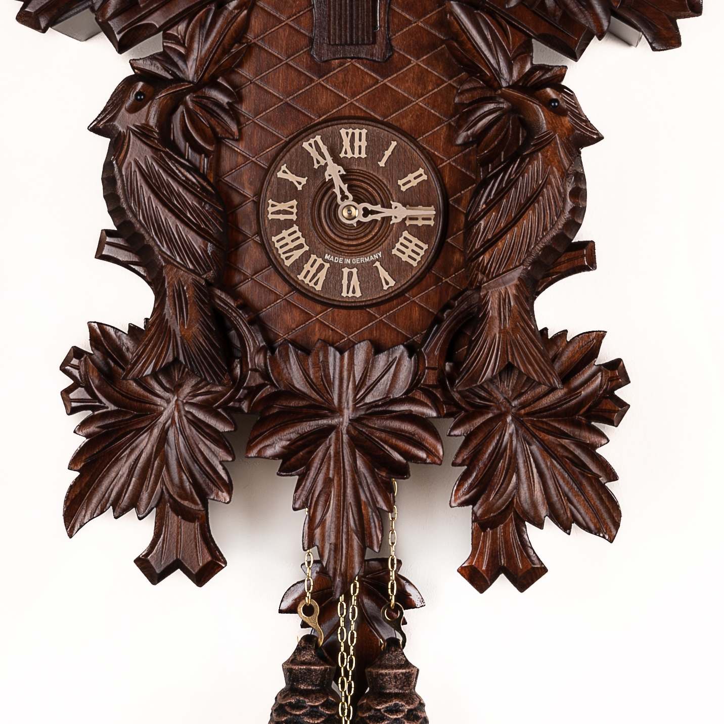 Механизм: Механические часы с кукушкой, которые работают от гирь на цепной тяге. Сделан на фирме SBS-Feintechnik GmbH & Co. KG Германия. Запас хода на 8 дней. Ручное отключение звука. В каждые пол часа кукушка появляется из своего домика, наклоняется и воспроизводит звук кукушки (ку-ку) один раз, в каждый полный час она кукует столько раз сколько показывают стрелки на часах. Одна гиря в данных часах отвечает за ход часового механизма, а вторая за механизм кукушки.