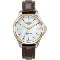 Корпус: Корпус выполнен из высококачественной нержавеющей стали 316L с полировкой и матовой шлифовкой - сатинированием с частичным IP покрытием. Перламутровый циферблат белого цвета декорирован 1 бриллиантом, золотистые стрелки и часовые индексы. Стрелки с люминесцентным покрытием для оптимальной разборчивости в условиях низкой освещенности. Сапфировое стекло с антибликовым покрытием. Диаметр: 36 мм. Водозащита: 50 м.