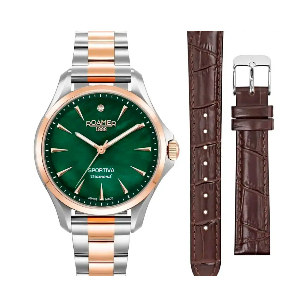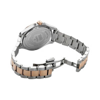 Корпус: Корпус выполнен из высококачественной нержавеющей стали 316L с полировкой и матовой шлифовкой - сатинированием с частичным IP покрытием. Перламутровый циферблат зелёного цвета декорирован 1 бриллиантом, золотистые стрелки и часовые индексы. Стрелки с люминесцентным покрытием для оптимальной разборчивости в условиях низкой освещенности. Сапфировое стекло с антибликовым покрытием. Диаметр: 36 мм. Водозащита: 50 м.