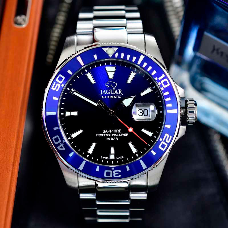 Корпус: Часы изготовлены из нержавеющей стали 316L, поверхности с матовой шлифовкой сатинированием и глянцевой полировкой. Этот тип стали, благодаря своему составу, особенно устойчив к коррозии, отличается высокой прочностью и устойчивостью к царапинам. Вращающийся в одну сторону безель. Синий циферблат. Стальные часовые индексы и стрелки с люминесцентным покрытием Super-LumiNova, обеспечивают идеальную читаемость. Сапфировое стекло с антибликовым покрытием, предотвращающее появление неприятных отражений, которые мешают правильному считыванию циферблата при определенных условиях освещения. Завинчивающаяся заводная головка. Диаметр: 43,5 мм. Водонепроницаемость: 200 м.