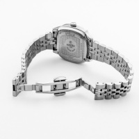 Корпус: Корпус изготовлен из высококачественной нержавеющей стали, марки 316L. Черный перламутровый/матовый циферблат. Накладные часовые индексы и стрелки выполнены из полированной стали с люминесцентным покрытием Super-Luminova, которое светится в темноте после непродолжительной зарядки на свету. Сапфировое стекло с антибликовым покрытием защищает циферблат от царапин и обеспечивает отличную читаемость при любом освещении. Рифлёная заводная головка. Размер корпуса: 32 x 32 мм. Водонепроницаемость: 50 метров.