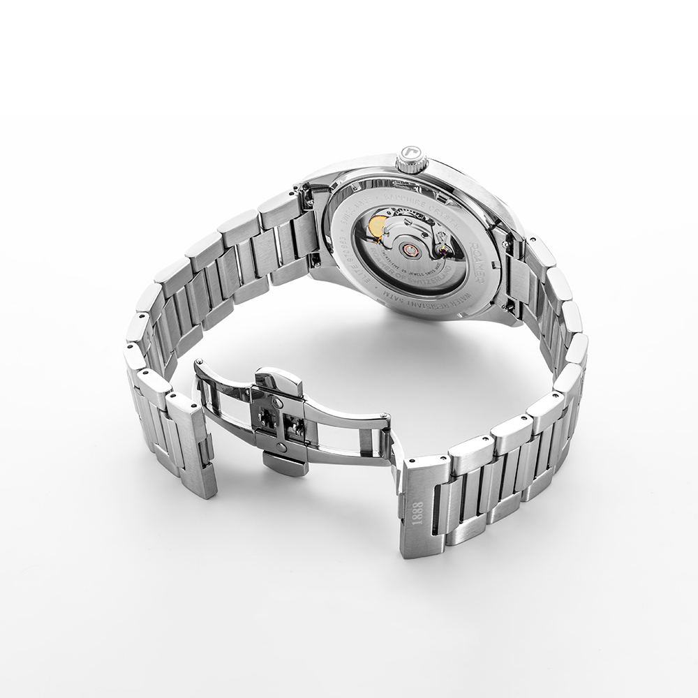 Ремешок: Браслет из высококачественной нержавеющей стали с повышенной устойчивостью к коррозии, поверхности с матовой шлифовкой – сатинированием и полировкой до зеркального блеска. Раскладывающеяся стальная застежка с дополнительной фиксацией. Часы дополнены черным кожаным ремешком.