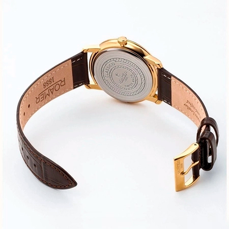 Корпус: Высококачественная нержавеющая сталь, марки 316L с IP покрытием из жёлтого золота. Металлик циферблат. Позолоченные стрелки и часовые индексы. Сапфировое стекло с антибликовым покрытием. Рифлёная заводная головка с логотипом марки «Roamer». Диаметр: 40 мм. Водонепроницаемость: 30 м.