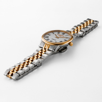 Корпус: Высококачественная нержавеющая сталь, марки 316L с частичным IP покрытием из жёлтого золота. Белый циферблат. Позолоченные стрелки и чёрные римские цифры. Сапфировое стекло с антибликовым покрытием. Рифлёная заводная головка с логотипом марки «Roamer». Диаметр: 30 мм. Водонепроницаемость: 30 м.