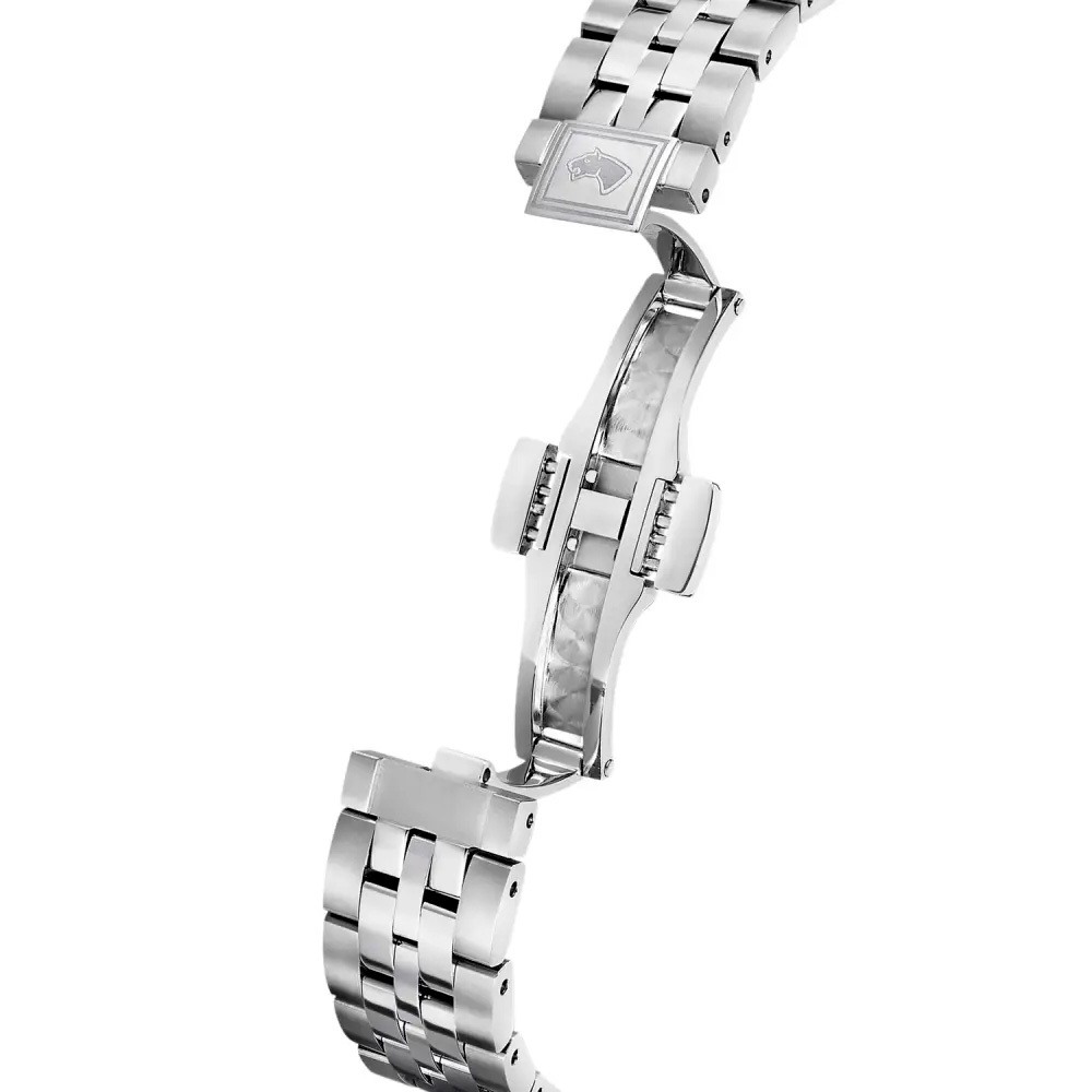 Ремешок: Нержавеющая сталь, поверхности с матовой шлифовкой - сатинированием и полировкой до зеркального блеска, застежка с тройным сложением в стиле “бабочка” раскрывается при нажатии боковых блокировочных кнопок.