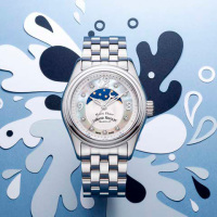 Корпус: Нержавеющая сталь. Перламутровый светлый циферблат, украшен декоративным узором - гильоше. Сапфировое стекло, устойчивое к механическим повреждениям. Механизм усложнен функцией – индикатором фазы луны, расположенной в районе двенадцатичасовой отметки. Диаметр 34 мм. Водозащита 100 м.