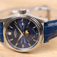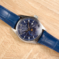 Корпус: Нержавеющая сталь. Синий циферблат, украшен декоративным узором - гильоше. Рифленая заводная головка. Сапфировое стекло с антибликовым покрытием, устойчивое к механическим повреждениям. Прозрачная задняя крышка. Диаметр 42 мм. Водозащита 100 м.
