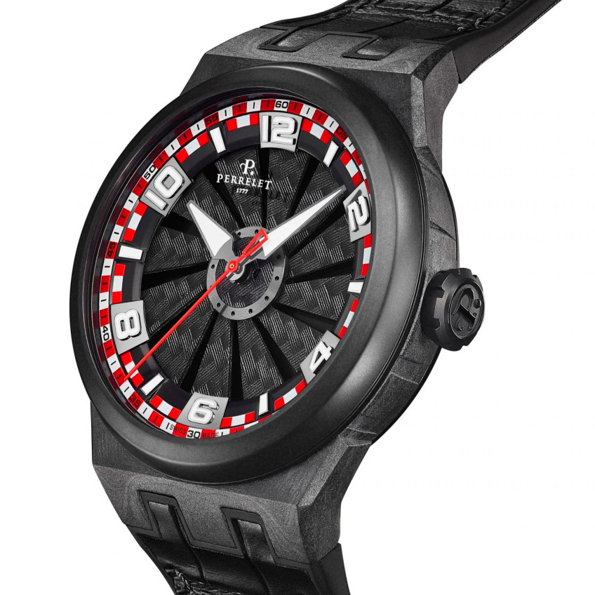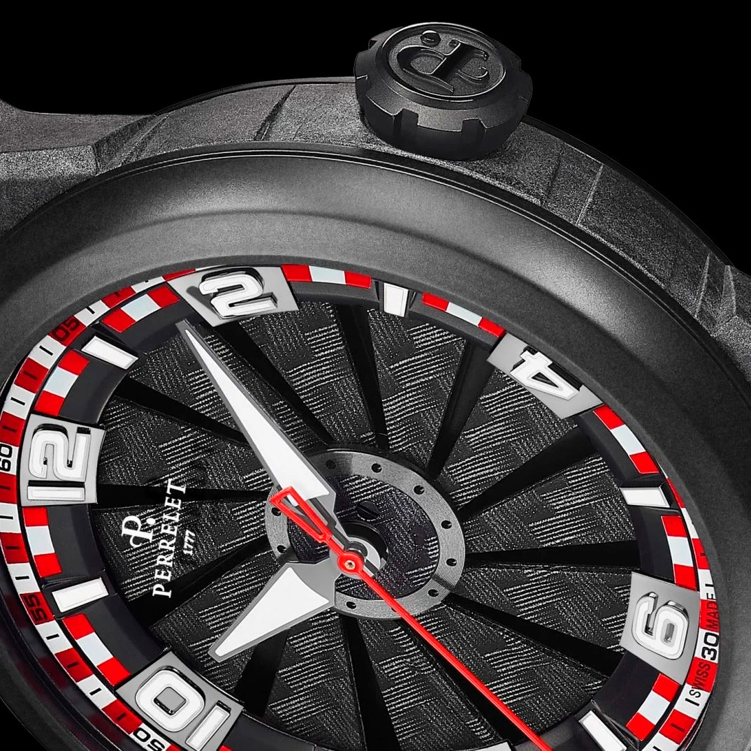 Корпус: Круглый корпус выполнен выполнен из карбона и высокосортной нержавеющей стали со стойким к царапинам PVD покрытием черного цвета. Циферблат с видимым ротором автоподзавода чёрного цвета. Поверхность циферблата под вращающимся в двух направлениях ротором черного цвета. На внешней стороне циферблата нанесена контрастная красно-белая окраска, обращающаяся к гоночной эстетике Формулы 1 в виде сигнальных флагов. Аппликация цифр с люминесцентным составом светящимся в темноте. Сапфировое стекло имеет антибликовое покрытие с обеих сторон. Диаметр корпуса 44 мм, толщина - 13,8 мм. Заводная коронка украшена миниатюрой с эмблемой марки. Задняя крышка с прозрачным стеклом. Водостойкость 100 метров.