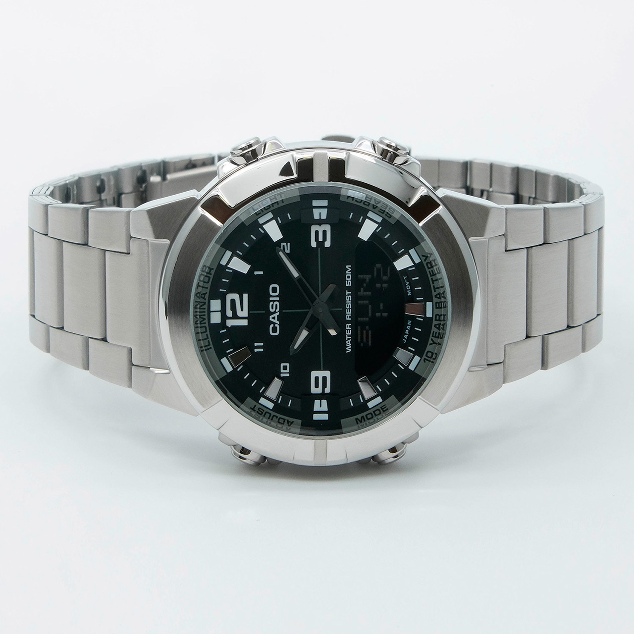 Функции: Аналогово - цифровое отображение текущего времени. Секундомер с точностью показаний 1/100 сек и максимальным временем измерения - 24 час. Таймер обратного осчета. 3 ежедневных будильника. Функция повтора сигнала будильника (Snooze). Автоматический календарь. Записная телефонная книжка для хранения фамилий и номеров телефонов. Максимальная емкость - 30 абонентов. Электронный циферблат подсвечивается светодиодом.