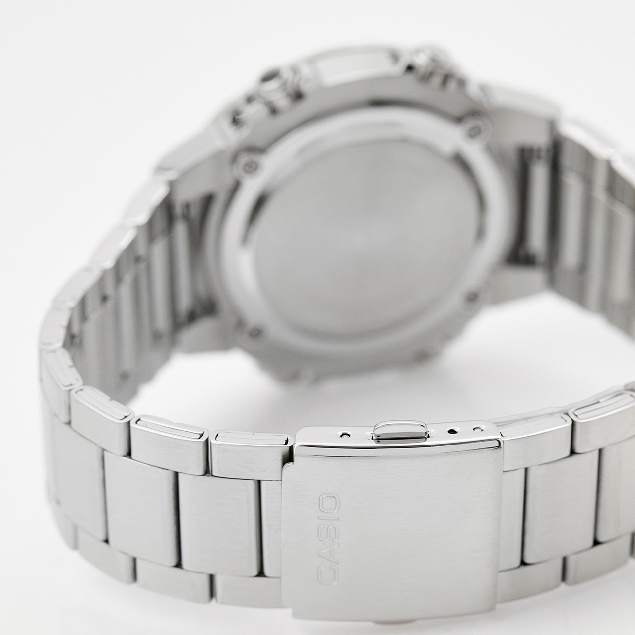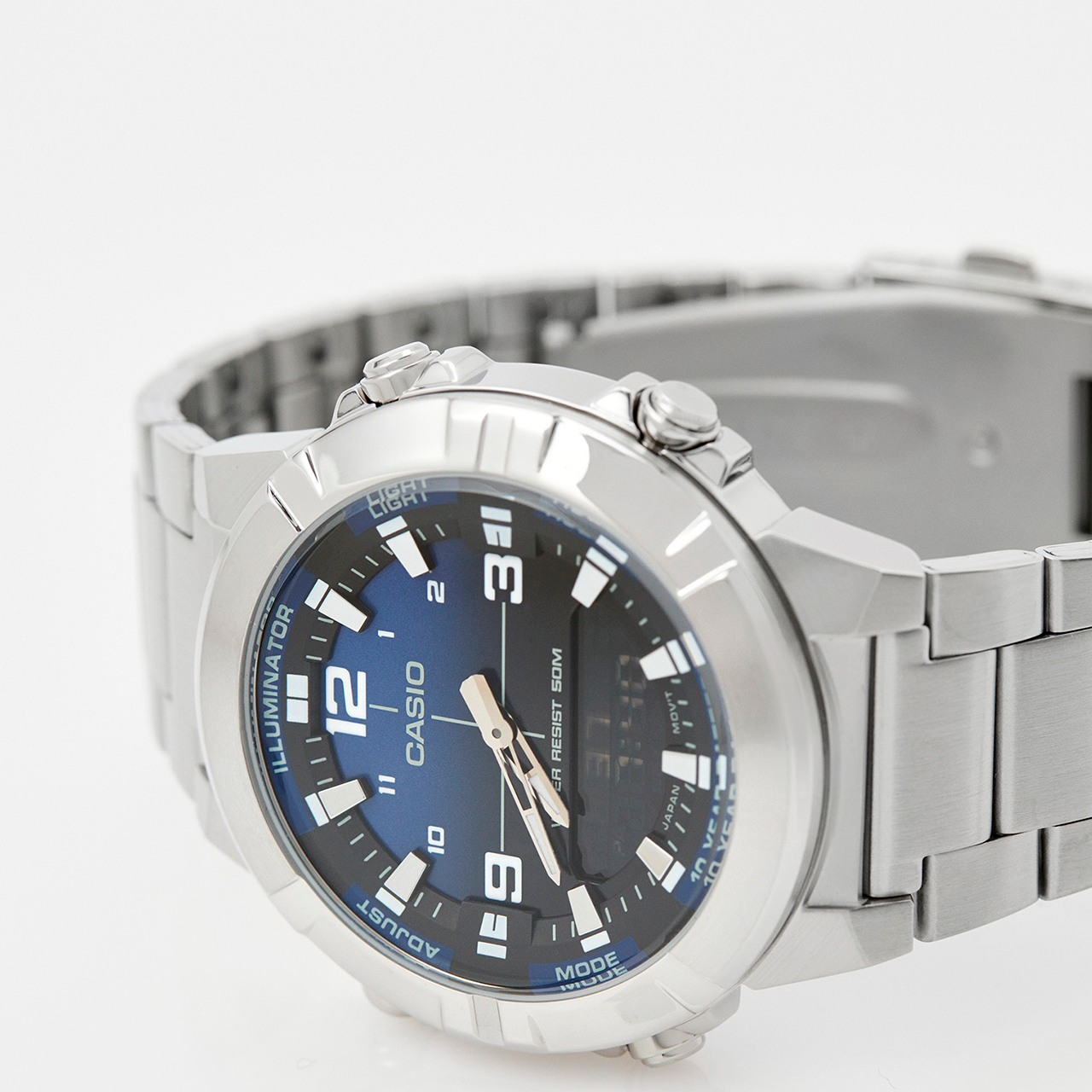 Корпус: Корпус часов выполнен из нержавеющей стали. Цвет циферблата: синий. Необритовое светонакопительное покрытие, нанесенное на стрелки, обеспечивает длительное послесвечение в темноте даже после кратковременного нахождения на свету. Прочное, устойчивое к царапинам минеральное стекло защищает часы от повреждений. Светодиодная подсветка. Габаритные размеры: 44х51,5мм, толщина 12,3мм, вес 166г. Водозащита: 50WR.