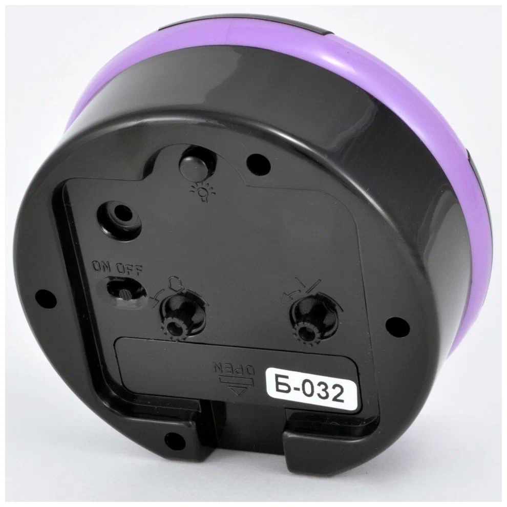 Материал и цвет: Корпус будильника сделан из глянцевого пластика черного цвета с фиолетовыми вставками. Стекло – пластиковое. Белый циферблат с крупными чёрными арабскими цифрами.