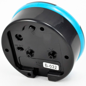 Материал и цвет: Корпус будильника сделан из глянцевого пластика черного цвета с голубыми вставками. Стекло – пластиковое. Четкий легко читаемый циферблат с крупными чёрными арабскими цифрами.