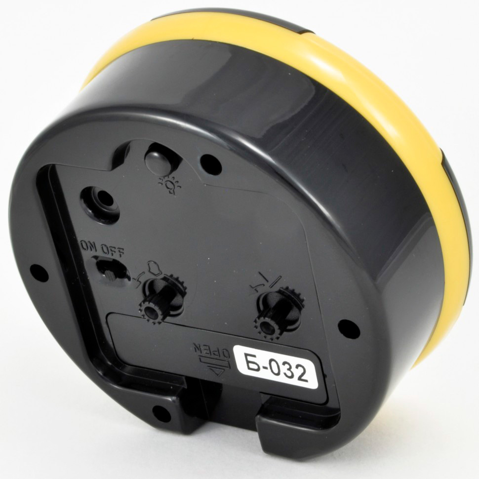 Материал и цвет: Корпус будильника сделан из глянцевого пластика черного цвета с жёлтыми вставками. Стекло – пластиковое. Четкий легко читаемый циферблат с крупными чёрными арабскими цифрами.