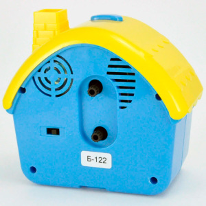 Материал и цвет: Корпус будильника сделан в виде домика из пластика синего/жёлтого цвета. Стекло – пластиковое. Белый/зелёный циферблат с крупными чёрными арабскими цифрами.