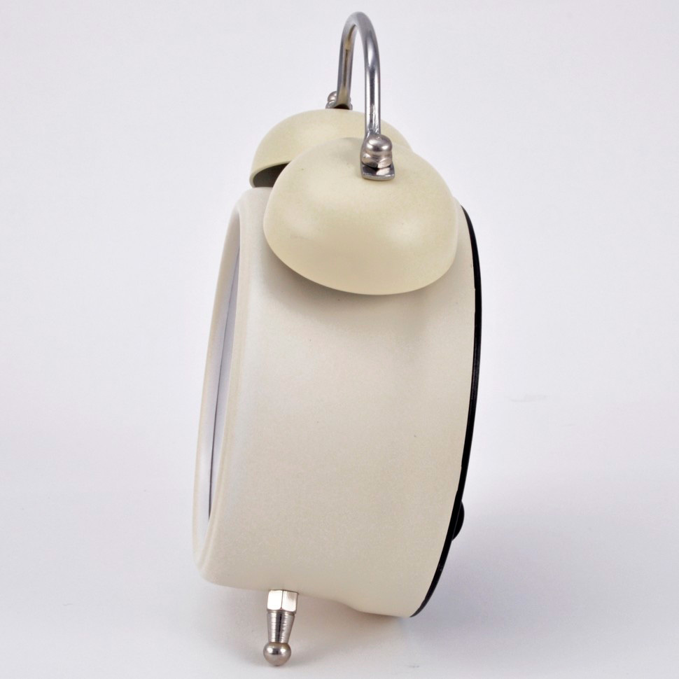 Материал и цвет: Корпус будильника изготовлен из пластика, к которому крепятся два металлических колокольчика, окрашенных в цвет корпуса. При звонке молоточек ударяет по колокольчикам. Стекло – минеральное.