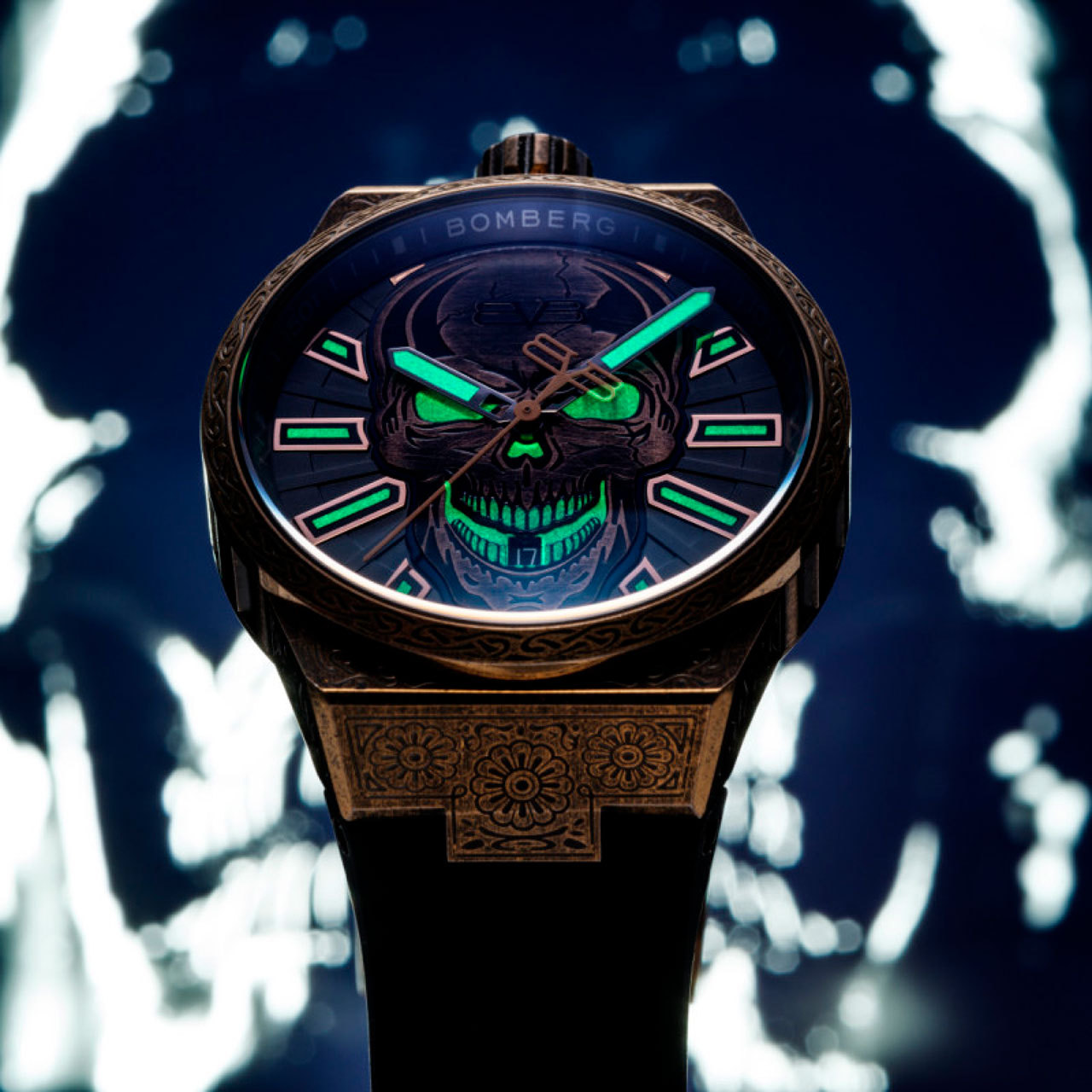 Корпус: Корпус из нержавеющей стали марки 316L с PVD - покрытием бронза, украшен замысловатой гравировкой Древа Жизни, символизирующей гармонию и связь. На циферблате чёрного цвета изображен уникальный рельефный череп. Индексы и цифры с родиевым покрытием. Фотолюминесцентное покрытие Super-Luminova® на индексах и стрелках добавляет остроты, обеспечивая при этом идеальную читаемость даже в самых темных условиях. Сапфировое стекло с антибликовым покрытием.