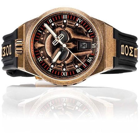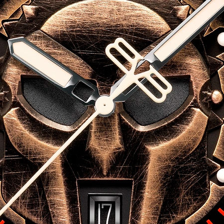 Корпус: Нержавеющая сталь марки 316L с PVD-покрытием бронза. Чёрный циферблат. Индексы и цифры с родиевым покрытием. На циферблате изображена бронзовая маска гладиатора. Фотолюминесцентное покрытие Super-Luminova® на индексах и стрелках добавляет остроты, обеспечивая при этом идеальную читаемость даже в самых темных условиях. Сапфировое стекло с антибликовым покрытием. Завинчивающаяся заводная головка на 12ч. Диаметр: 43 мм. Водозащита: 100 м.