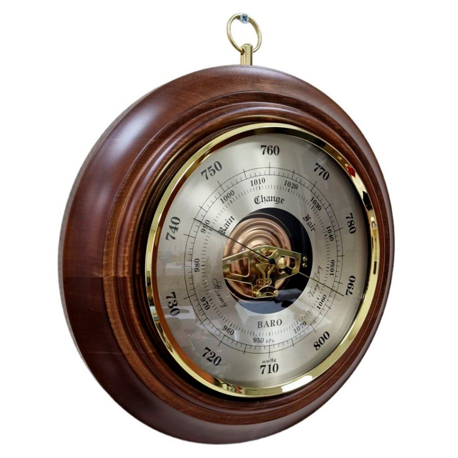 Описание: Барометр от российской компании "Бриг+", предназначен для измерения атмосферного давления. Корпус изготовлен из высококачественного массива дерева темно-коричневого цвета, а металлическая фурнитура изготавливается только из полнотелой латуни. Настенный барометр с открытым механизмом гарантированно привлечет внимание ваших гостей. Размер 290 мм, диаметр барометра 190 мм, градуирован в мм. рт. ст. и hPa.