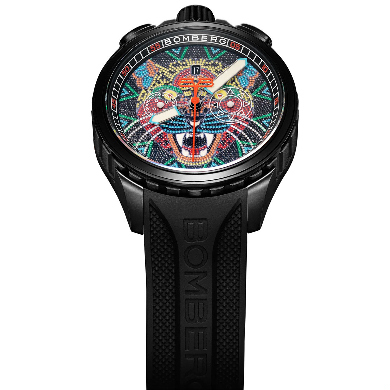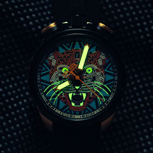 Корпус: Круглый корпус выполнен из нержавеющей стали марки 316L, стойкое к царапинам PVD покрытие черного цвета. Красочный ягуар, созданный в мексиканской технике уичоль на циферблате. Фотолюминесцентное покрытие Super-Luminova® на стрелках добавляет остроты, обеспечивая при этом идеальную читаемость даже в самых темных условиях. Уникальный дизайнс завинчивающейся заводной головкой в ​​положении «12 часов» и кнопок хронографа. Сапфировое стекло с антибликовым покрытием. Диаметр: 45 мм. Водозащита: 50 м.