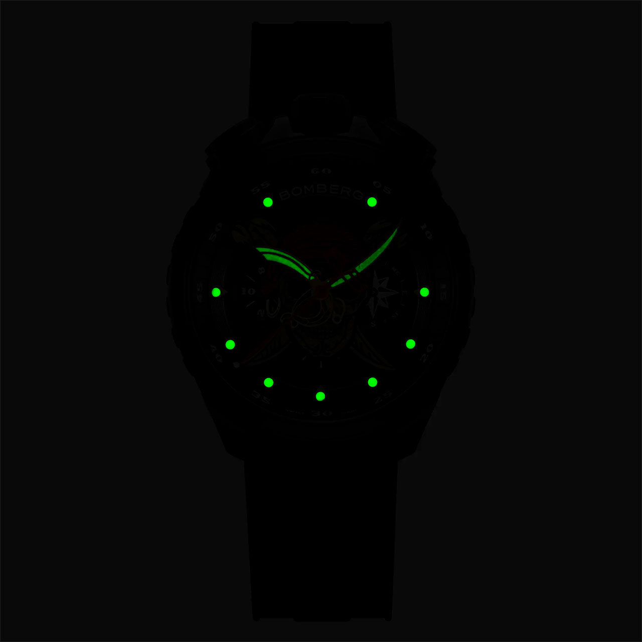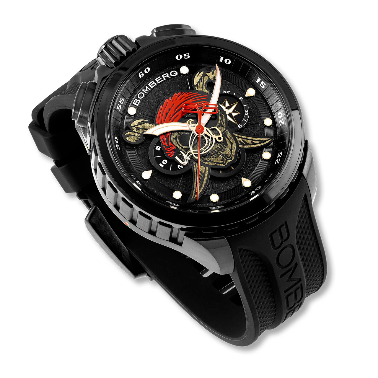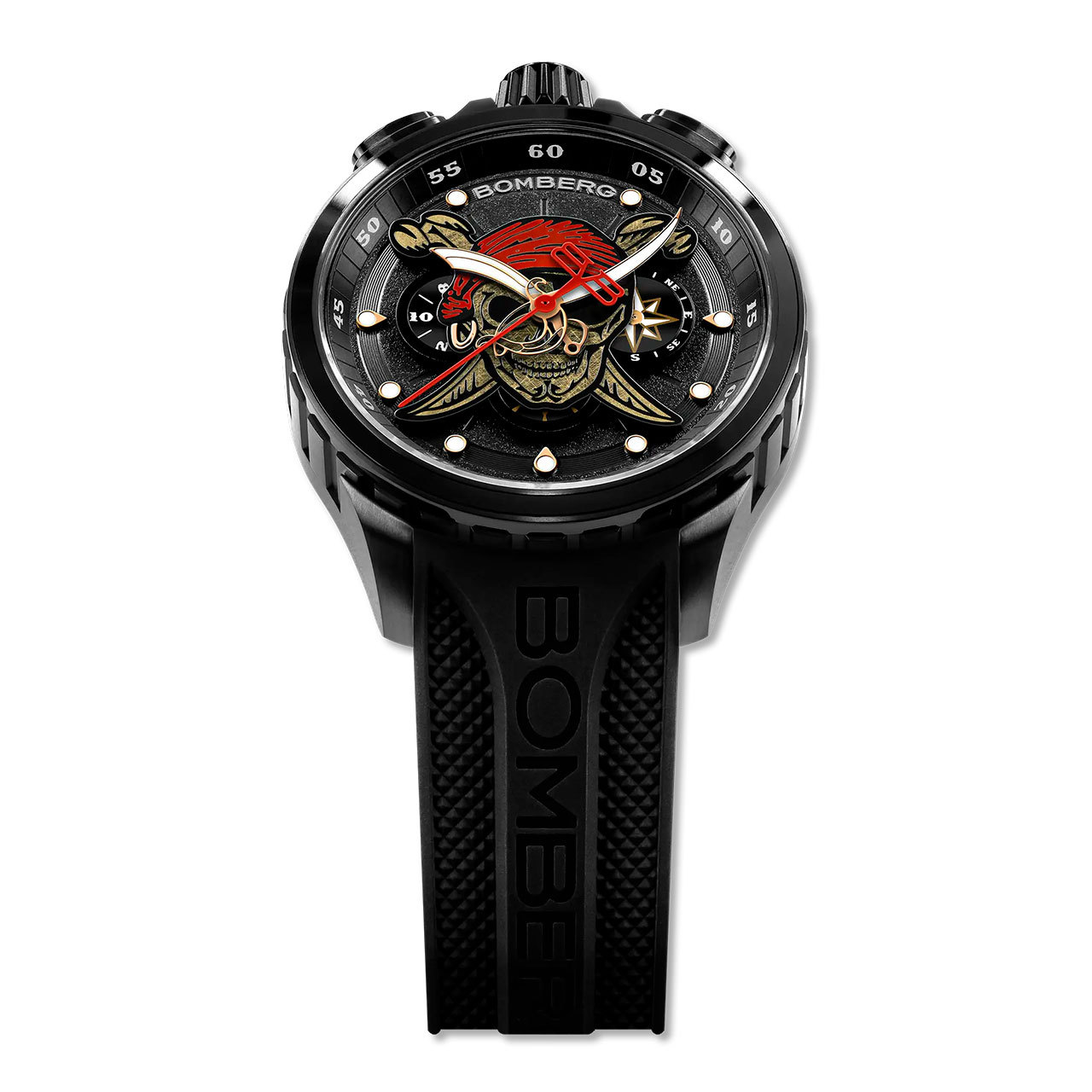 Корпус: Круглый стальной корпус марки 316L, с PVD покрытием черного цвета. Чёрный циферблат, часовые индексы и стрелки из белой латуни с люминесцентным покрытием (Super-LumiNova). На циферблате изображен уникальный рельефный череп. Сапфировое стекло с антибликовым покрытием. Уникальный дизайн с завинчивающейся заводной головкой в ​​положении «12 часов» и кнопок хронографа. Завинчивающаяся задняя крышка. Диаметр: 45 мм. Водозащита: 50 м.