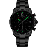 Функции: Индикация часов, минут при помощи центральных стрелок. Окошко даты на "6 часов". Хронограф. Счётчик 12 -ти часов расположен в положении " 10 часов", 30-минутный счётчик на " 2 часа", малая секундная стрелка на "6 часов".