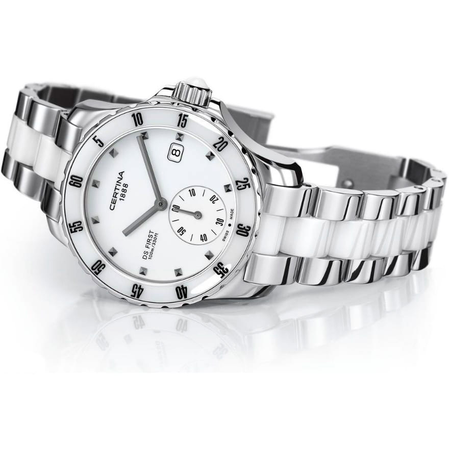 Корпус: Корпус из нержавеющей полированной/матовой стали. Безель с 60 - минутной шкалой на керамическом белом кольце. Белый циферблат. Стрелки и часовые индексы серебристого цвета. Сапфировое стекло. Диаметр 34.8 мм. Водостойкость 100 м. Система DS.
