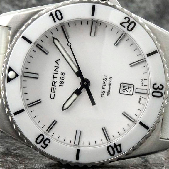 Корпус: Корпус из нержавеющей полированной/матовой стали. Безель с 60 - минутной шкалой на керамическом белом кольце. Белый циферблат. Стрелки и часовые индексы серебристого цвета. Сапфировое стекло с антибликовым покрытием. Диаметр 41 мм. Водостойкость 200 м. Система DS.