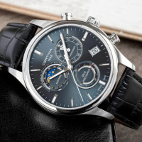 Функции: Индикация часов, минут при помощи центральных стрелок. Хронограф с 12-ти часовым, 60-ти секундным и 30-ти минутным счетчиками, индикация фазы луны и лунного цикла, индикация даты на "4" часа, вынесенная секундная стрелка на "6" часов.