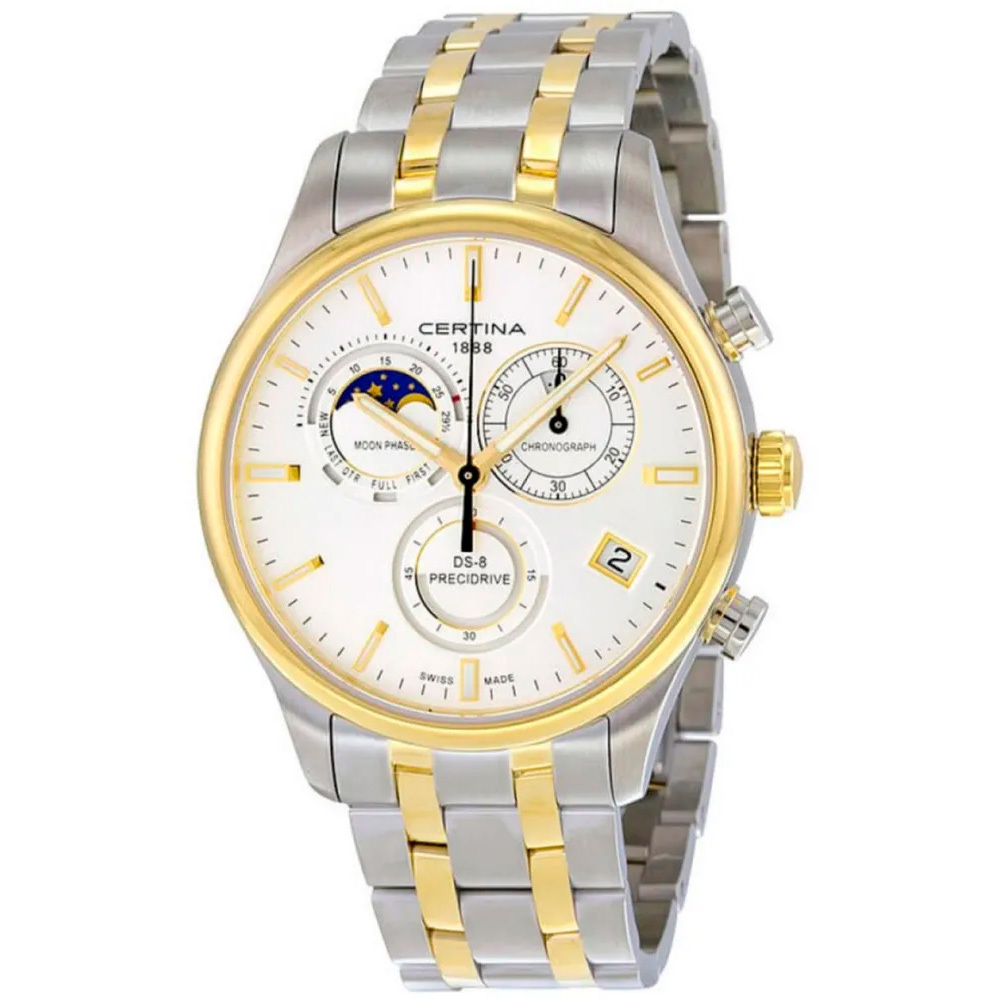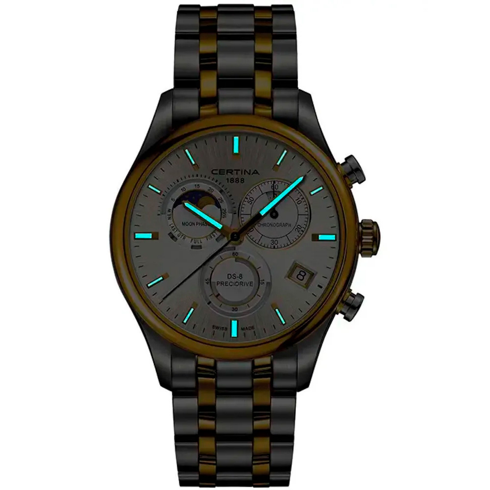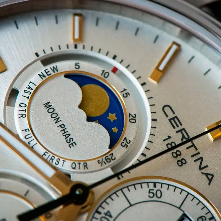 Функции: Индикация часов, минут при помощи центральных стрелок. Хронограф с 12-ти часовым, 60-ти секундным и 30-ти минутным счетчиками, индикация фазы луны и лунного цикла, индикация даты на "4" часа, вынесенная секундная стрелка на "6" часов.