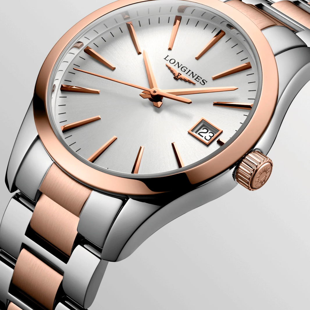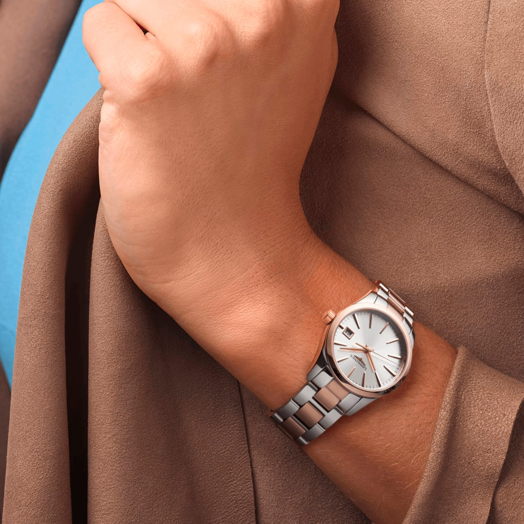 Корпус: Нержавеющая сталь марки 316L, поверхности с матовой шлифовкой сатинированием и глянцевой полировкой. Безель и заводная головка с PVD-покрытием цвета розового золота. Циферблат серебристого цвета с радиальной шлифовкой в стиле “sunrays”. Аппликация часовых индексов, а также стрелки с алмазной огранкой имеют золотое покрытие и полировку. Устойчивое к царапинам сапфировое стекло с многослойным антибликовым покрытием изнутри. Водонепроницаемость 50 метров. Диаметр 34 мм.