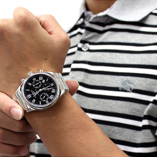 Функции: Индикация часов, минут при помощи центральных стрелок. Маленькая, отдельно вынесенная секундная стрелка. 30-ти минутный и 12-ти часовой счетчики хронографа, дата в отдельном окошке.