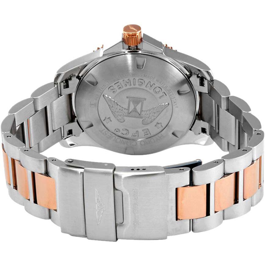 Корпус: Корпус выполнен из высококачественной стали с повышенной устойчивостью к коррозии, поверхности с матовой шлифовкой – сатинированием, полировкой до зеркального блеска с частичным PVD покрытием розового золота. Циферблат синего цвета с позолоченными стрелками и рисками. Индексы и стрелки с люминесцентным покрытием по технологии SuperLumiNova®. Стекло сапфировое с антибликовым покрытием. Однонаправленно вращающийся безель из анодированного алюминия, завинчивающиеся задняя крышка и заводная головка. Диаметр: 41 мм. Водозащита: 300 м.