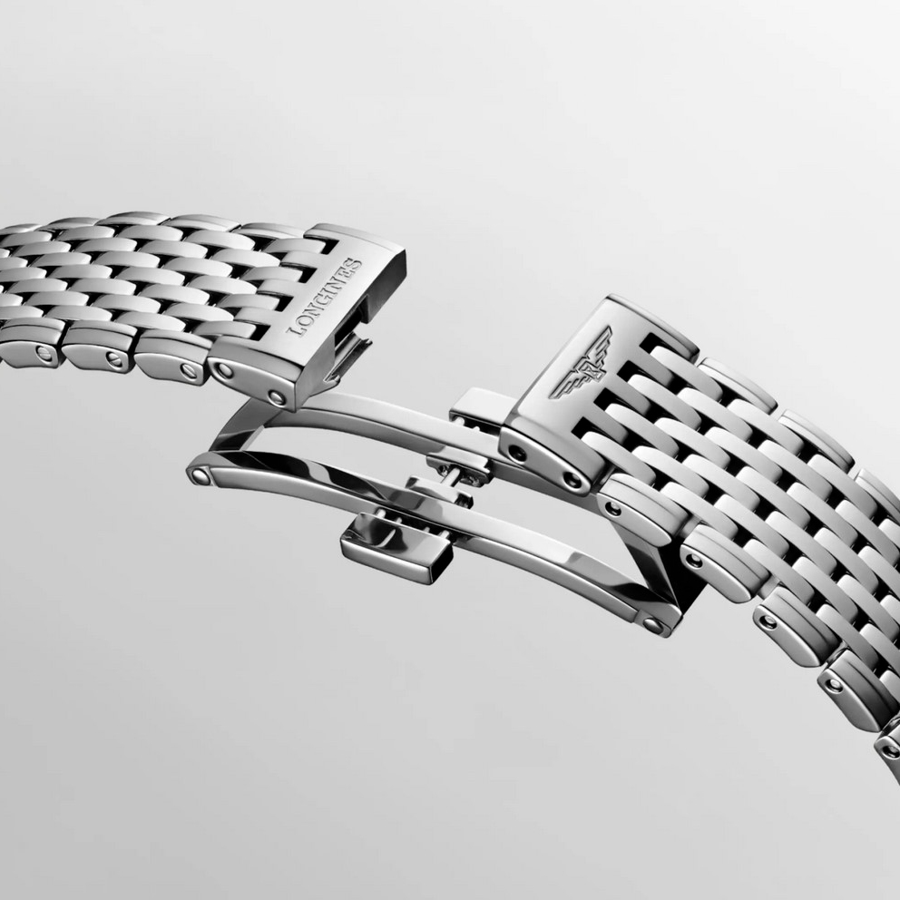Ремешок: Браслет из нержавеющей стали с литыми звеньями, браслетная застежка тройного сложения “бабочка” раскладывается при нажатии кнопок двойной фиксации.
