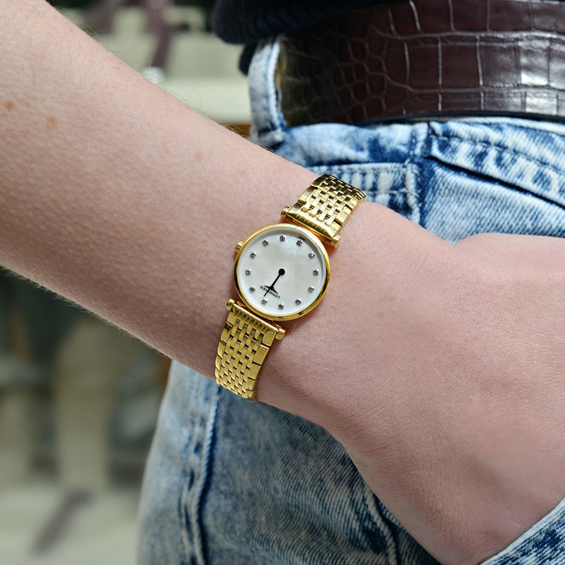 Корпус: Нержавеющая сталь + PVD-покрытие из желтого золота, сапфировое стекло, 12 бриллиантов на циферблате. Размер 24 мм, водонепроницаемость 30 метров. Циферблат – перламутровый белый.
