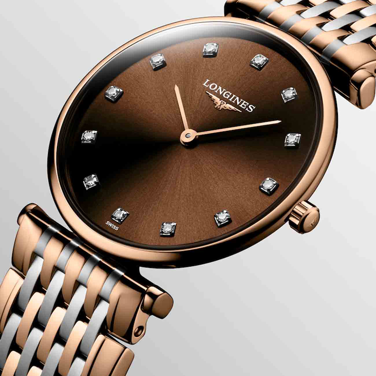 Корпус: Корпус выполнен из высококачественной стали с повышенной устойчивостью к коррозии, поверхности с матовой шлифовкой – сатинированием и полировкой до зеркального блеска с частичным PVD- покрытием из розового золота. Циферблат Sunray brown с 12 бриллиантами группы Top Wesselton VS-SI общим весом 0.081 карата. Cтрелки: полировка до алмазного блеска. Сапфировое стекло. Диаметр: 29 мм. Водостойкость: 30 м.