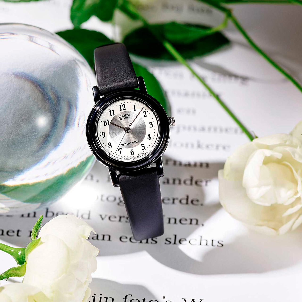 Корпус: Ударопрочный корпус часов чёрного цвета из полимерного материала защищает механизм от ударов и вибрации. Пластиковое стекло. Водонепроницаемость: 30 м. Размер корпуса: 25 × 25 × 7 мм.