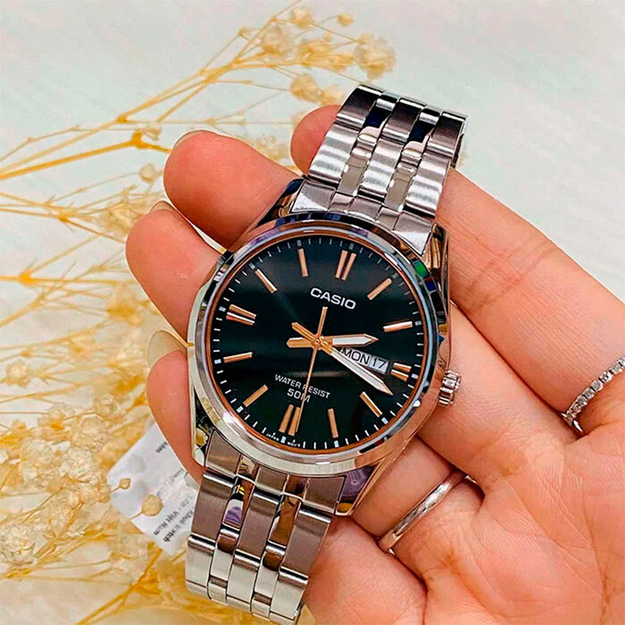 Корпус: Корпус изготовлен из гипоаллергенной латуни. Чёрный циферблат с золотистыми метками в виде штрихов. Прочное минеральное стекло обеспечит защиту часов от повреждений. Стрелки покрыты люминесцентным напылением (светятся в темноте). Диаметр: 36 мм. Водонепроницаемость: 50 м.