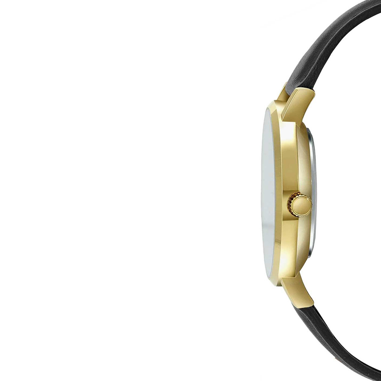 Корпус: Ударопрочный корпус часов сделан из нержавеющей стали с IP покрытием. Минеральное стекло устойчивое к возникновению царапин. Чёрный циферблат с золотистыми стрелками и часовыми индексами. Диаметр: 34 мм. Водонепроницаемость: 30 м.