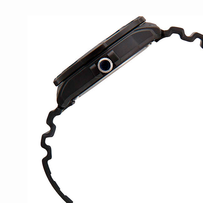 Корпус: Корпус из высококачественного полимерного материала – прочного, легкого и долговечного. Вращающийся безель с яркой контрастной разметкой. Циферблат белого цвета с разметкой «милитари», крупные контрастные метки или цифры. Светонакопительное покрытие обеспечивает длительное послесвечение в темноте даже после кратковременного нахождения на свету. Выступы корпуса служат защитой для переводной коронки из нерж. стали. Задняя крышка соединяется с корпусом 4 винтами. Диаметр корпуса 44,6 мм, высота вместе с дужками – 47,9 мм, толщина 11,6 мм. Вес приблизительно 39 грамм. Водозащита до 100 метров (10 АТМ).