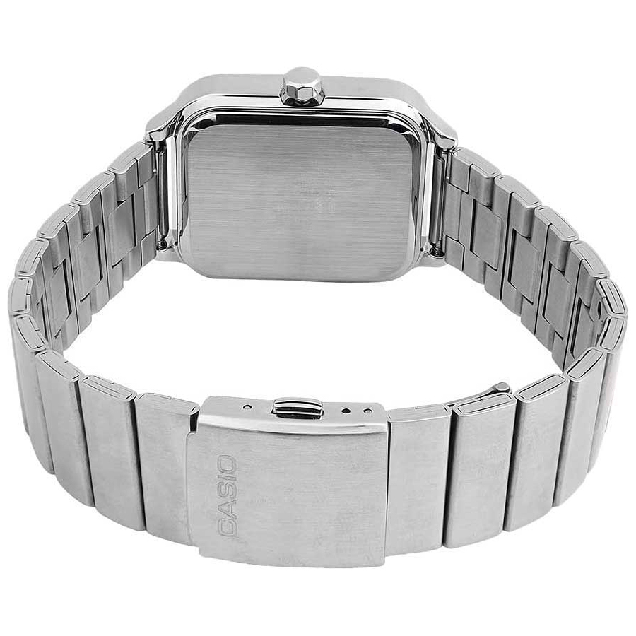 Корпус: Прямоугольный корпус хромированного цвета из нержавеющей стали. Циферблат выполнен по технологии Sunray (солнечные лучи) бежевого цвета. Стрелки, метки в виде штрихов и арабской цифры синего цвета. Минеральное стекло защищает циферблат от повреждений. Габаритные размеры: 34х44,5мм, толщина 9,3мм. Водозащита: 5 ATM.