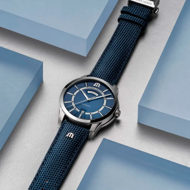 Ремешок: Нейлоновый ремешок синего цвета с кожаной подложкой и логотипом Maurice Lacroix «M», с раскладывающейся застежкой из стали. Система быстрой замены ремешка.
