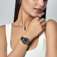 Корпус: Нержавеющая сталь. Минеральное стекло. Сквозь прозрачное окошко на циферблате можно наблюдать работу механизма часов. Часы украшены кристаллами. Синий циферблат. Водозащита - 30 метров. Диаметр 36 мм.