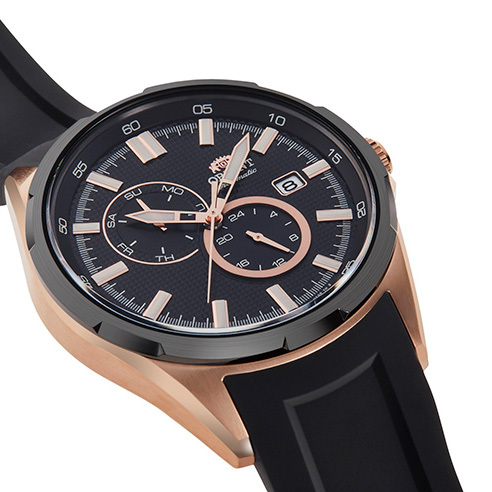 Корпус: Круглый корпус выполнен из полированной нержавеющей стали с IP покрытием цвета розового золота. Черный циферблат. Прочное минеральное стекло устойчивое к мелким механическим повреждениям. Заводная головка с защитой. Завинчивающаяся задняя крышка. Водозащита 100 метров. Диаметр 42 мм.