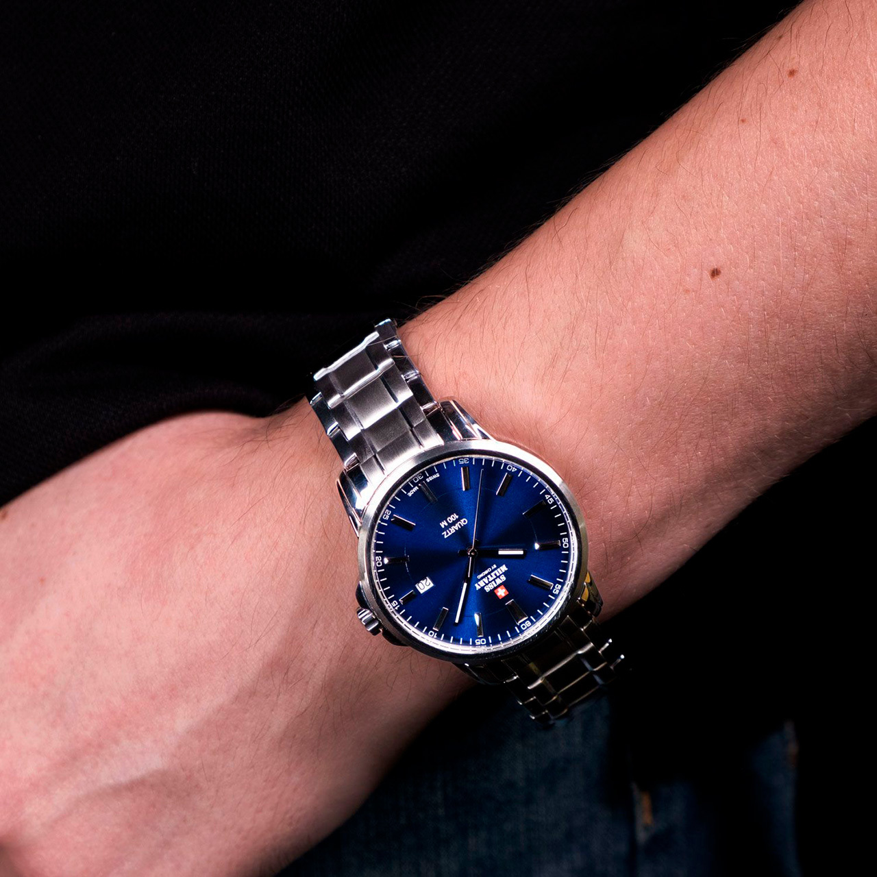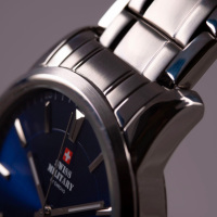 Корпус: Корпус выполнен из нержавеющей стали. Синий циферблат. Стрелки и часовые индексы из полированного металла. Минеральное стекло с сапфировым покрытием. Водонепроницаемость 100 метров. Диаметр 40 мм.
