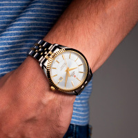 Корпус: Корпус выполнен из нержавеющей стали с частичным PVD покрытием цвета желтого золота. Светлый циферблат. Минеральное стекло с сапфировым покрытием. Водонепроницаемость 50 метров. Диаметр 40 мм.