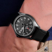 Корпус: Корпус выполнен из нержавеющей стали с IP покрытием. Циферблат черный. Минеральное стекло с сапфировым покрытием. Заводная головка с защитой. Диаметр корпуса составляет 42 мм. Водостойкость: 50 метров.