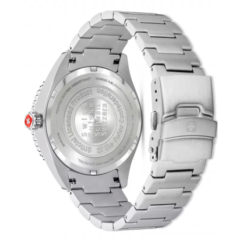 Корпус: Круглый корпус изготовлен из нержавеющей стали. Синий циферблат выполнен по технологии Sunray (солнечные лучи), защищенный высокопрочным сапфировым стеклом, украшен фирменным логотипом Swiss Military Hanowa в положении 12 часов. Стрелки и метки в виде штрихов и арабской цифры с нанесенным люминесцентным составом, который светится в темноте. Вращающийся рифленый безель. Рифленая заводная головка. Завинчивающаяся задняя крышка. Диаметр: 42 мм. Водозащита: 100 м.