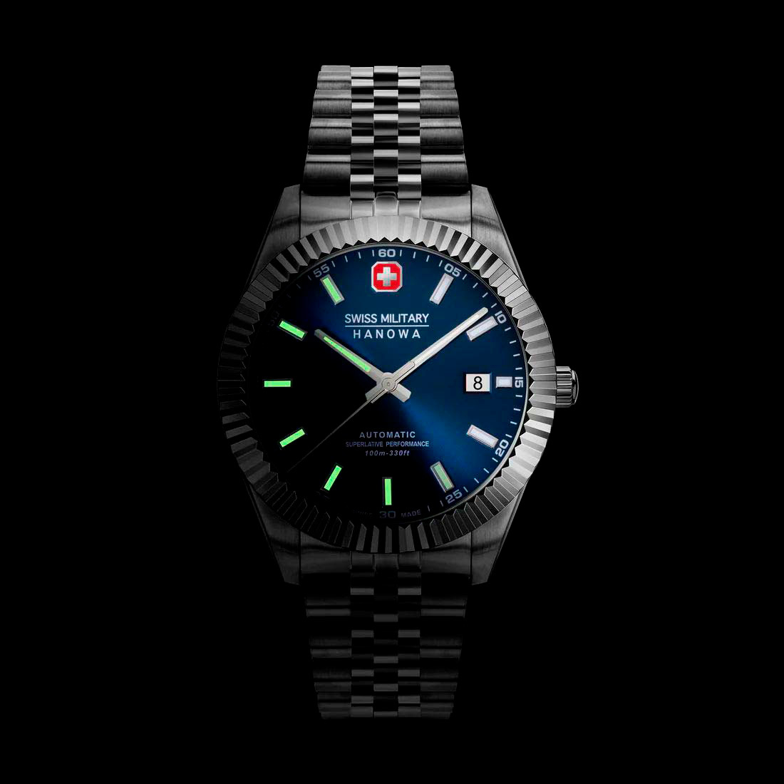 Корпус: Круглый корпус выполнен из нержавеющей стали 316. Рифленый безель. Циферблат синего цвета выполнен по технологии Sunray (солнечные лучи) и защищен прочным сапфировым стеклом. Метки в виде штрихов, фирменный логотип Swiss Military Hanowa в положении 12 часов. Стрелки и метки с люминесцентным покрытием, которое светится в темноте после непродолжительной зарядки на свету. Завинчивающаяся задняя крышка с сапфировым стеклом. Рифленая заводная головка украшена фирменным логотипом. Диаметр 41 мм. Водонепроницаемость 100 м.