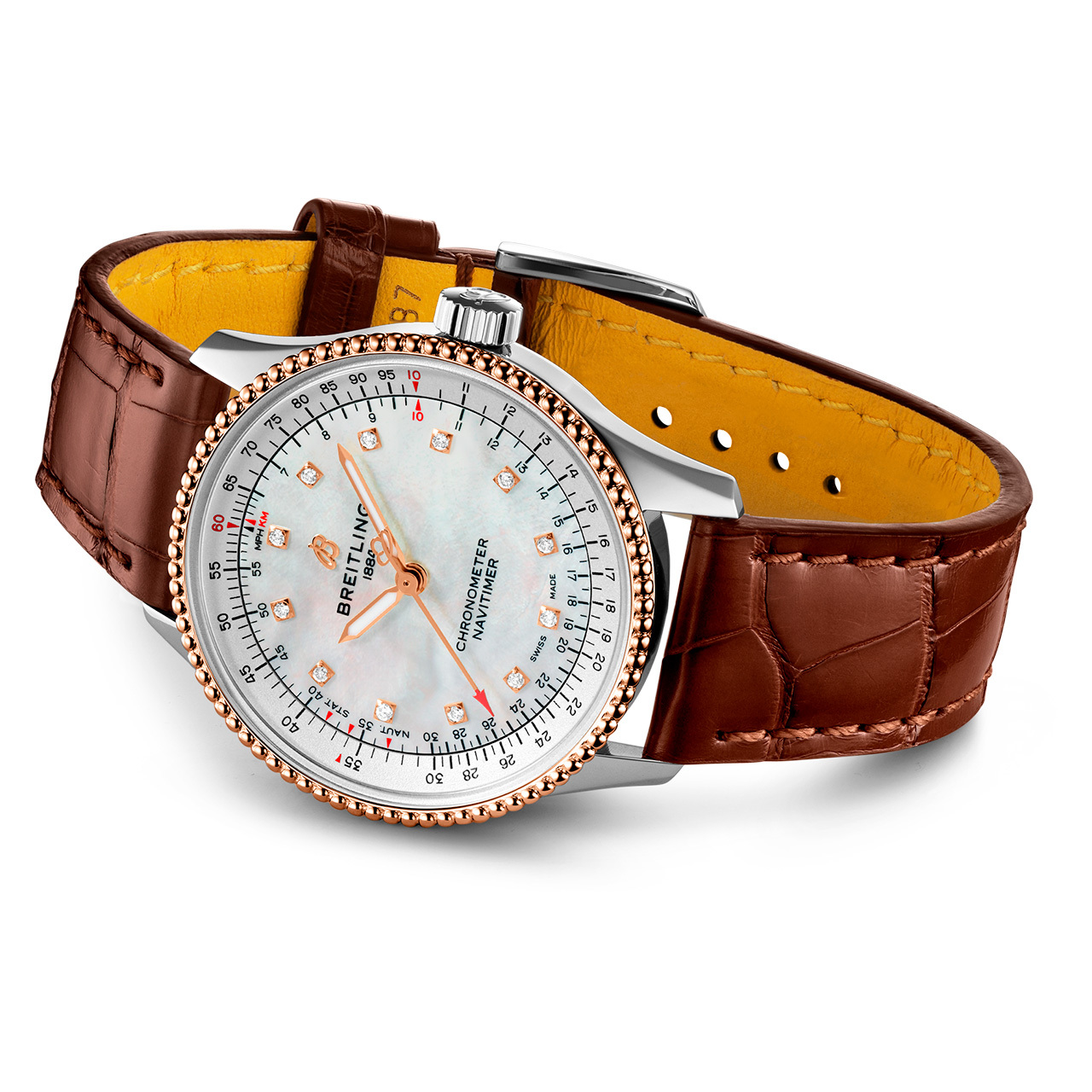 Корпус: Корпус выполнен из высококачественной стали с повышенной устойчивостью к коррозии, поверхности с матовой шлифовкой – сатинированием и полировкой до зеркального блеска. Циферблат в стиле “пилот” из натурального перламутра. Аппликация часовых индексов и финишной обработкой. Инкрустация 12 бриллиантов в качестве часовых индексов. Выгнутое сапфировое стекло с антибликовым покрытием нанесенным с обеих сторон. Задняя крышка имеет резьбовое соединение с корпусом. Диаметр корпуса 35 мм. Водозащита 30 м.